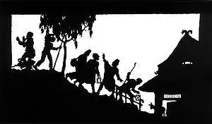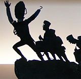 Since the late 18th century, silhouette artists have also made small scenes cut from card and mounted on a contrasting background like the portraits. These pictures, known as "paper cuts", were often, but not necessarily, silhouette images.[27] Among 19th century artists to work in this way was the author Hans Christian Andersen.[28] The modern artist Robert Ryan creates intricate images by this technique, sometimes using them to produce silk-screen prints.[29]