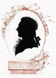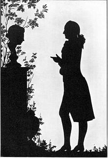 The work of the physiognomist Johann Caspar Lavater, who used silhouettes to analyse facial types, is thought to have promoted the art.[14] The 18th century silhouette artist August Edouart cut thousands of portraits in duplicate. His subjects included French and British nobility and US presidents. Much of his personal collection was lost in a shipwreck.[15] In England, the best known silhouette artist, a painter not a cutter, was John Miers, who travelled and worked in different cities, but had a studio on the Strand in London.[16] He advertised "three minute sittings",[17] and the cost might be as low as half a crown around 1800. Miers' superior products could be in grisaille, with delicate highlights added in gold or yellow, and some examples might be painted on various backings, including gesso, glass or ivory.[18] The size was normally small, with many designed to fit into a locket, but otherwise a bust some 3 to 5 inches high was typical, with half- or full-length portraits proportionately larger.