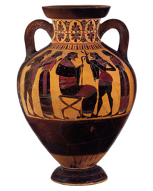 - In accord with the myth, Greek Black-figure pottery painting,[8] also known as the black-figure style or black-figure ceramic (Greek, μελανόμορφα, melanomorpha, common between the 7th and 5th centuries BC) employs the silhouette and characteristic profile views of figures and objects on pottery forms. The pots themselves exhibit strong forms in outline that are indicators of their purpose, as well as being decorative.[9]