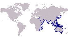 The Sillaginidae are distributed throughout the Indo-Pacific region, ranging from the west coast of Africa to Japan and Taiwan in the east, as well occupying as a number of small islands including New Caledonia in the Pacific Ocean.[16] While they have a fairly wide distribution, the highest species densities occur along the coasts of India, China, Taiwan, South East Asia, the Indonesian Archipelago and northern Australia.[5] One species of sillaginid, Sillago sihama, has been declared an invasive species to the Mediterranean, passing through the Suez Canal from the Red Sea since 1977 as part of the Lessepsian migration, becoming widespread.[20]