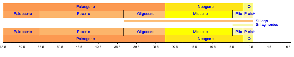A number of sillaginids have been identified from the fossil record, with the lower Eocene marking the first appearance of the family. The family is thought to have evolved in the Tethys Sea of central Australia, before colonizing southern Australia during the upper Eocene after a seaway broke through south of Tasmania.[5] During the Oligocene, the family spread to the north and south, occupying a much more extensive range than their current Indo-Pacific distribution. Fossils suggest the sillaginids ranged as far north as Poland and Germany, and as far south as New Zealand,[10] found in shallow water sedimentary deposits along with other species of extant genera.[11]