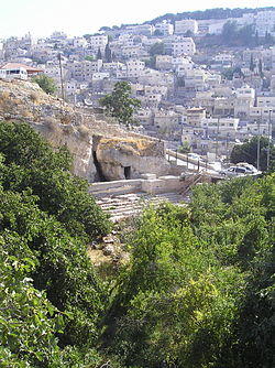 The neighborhood, originally a village, is built on the southern ridge of the Mount of Olives, where it slopes steeply from approximately 700–600 metres (2,300–2,000 ft) above sea level, until it reaches the Kidron Valley, bounding the neighborhood to the west.[10] The historical core of the village is in its northwestern section, adjacent to the "City of David" across the valley, which is the site of ancient Jerusalem. This location is where dozens of ancient burial tombs attributed to the time of ancient Israel and Judah as well as the Byzantine rule were found. The modern villagers used the tombs as dwellings or as enclosers for livestock. Many of the burial tombs are inhabited until today.[11] The village was built next to numerous water sources of historical importance, such as the Pool of Siloam (Ain Silwan), Gihon Spring and Ein Rogel. The rest of the village was built in the 19th century.[12]