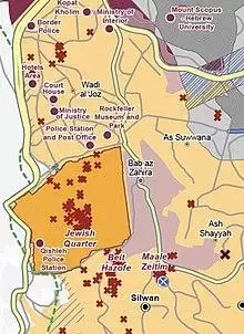 - ^ Hillel Cohen, The Rise and Fall of Arab Jerusalem: Palestinian Politics and the City since 1967, Routledge 2013 p.94.'Late in the Intifada, when Jewish settlement began in the Wadi Hilwe section of Silwan (“The City of David”) left-wing activists from Jerusalem worked together with people from Orient House in an attempt to stop the Jewish settlement in the neighbourhood '.