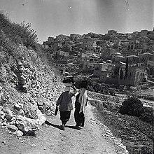 A photograph of the village taken between 1853 and 1857 by James Graham can be found on page 35 of Picturing Jerusalem by photographers James Graham and Mendel Diness. It shows the western part of the modern village as empty of habitations, a few trees are scattered across the southern ridge with the small village confined to the ridgetop east of the valley.[34]