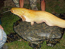 With a total length possibly up to 5 m (16 ft) and a maximum weight of over 300 kg (660 lb),[5] the wels catfish is by some margin the largest true freshwater fish (as opposed to anadromous or catadromous) in its region (Europe and parts of Asia). Such lengths are rare and unproven during the last century, but there is a somewhat credible report from the 19th century of a wels catfish of this size. Brehms Tierleben cites Heckl's and Kner's old reports from the Danube about specimens 3 m (9.8 ft) long and 200–250 kg (440–550 lb) in weight, and Vogt's 1894 report of a specimen caught in Lake Biel which was 2.2 m (7 ft 3 in) long and weighed 68 kg (150 lb).[6] In 1856, K. T. Kessler wrote about specimens from the Dnieper River which were over 5 m (16 ft) long and weighed up to 400 kg (880 lb).[7] (According to the Hungarian naturalist Ottó Hermann [1835-1914], catfish of 300–400 kilograms were also caught in Hungary in the old centuries from the Tisza river.) [8]