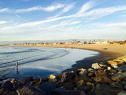 Silver Strand Beach is a one-mile-long sandy beach (1.6 km) about 150-yard in width (140 m).[11] It is capped by the north and south jetties which both have small parking lots and limited restroom facilities.[12] In February 2014, construction started close to the parking lot near the north jetty to build a 2-story lifeguard tower with restrooms to replace the previous one that was there since 1967, but demolished in 2002 due to storm damage.[13] The coast is a sandy bottom beach break which can sometimes feature rip tides and an undertow. Lifeguards are on duty every day during the summer and off duty from Sept to May.
