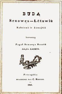 | Budą Senowęs Lietuwiû kalneniu ir Żemaitiû | Būdas senovės lietuvių, kalnėnų ir žemaičių | The Character of the Ancient Lithuanians, Highlanders, and Samogitians | Jokyb's Łaukys | 1845 | The first history of the culture of Lithuania |