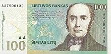 In 1927, a bronze bust by sculptor Juozas Zikaras was erected in the garden of the Vytautas the Great War Museum in Kaunas (the bust was destroyed by Soviet authorities and restored in 1988).[205] In 1983, Akmenė District Municipality turned the former clergy house in Papilė where Daukantas spent his last years into a memorial museum.[206] From 1993 to the introduction of the euro in 2015, Daukantas was featured on 100 litas banknotes. A monument by sculptor Regimantas Midvikis in his native Lenkimai was unveiled in 1993.[207] The Simonas Daukantas Award was established in 1989 for accomplishments in historical studies, literary work, or other cultural work. Awarded every two years, it is administered by the Skuodas District Municipality since 2003. Its past recipients included historians Vytautas Merkys, Alfredas Bumblauskas, Edvardas Gudavičius, linguist Giedrius Subačius.[207] His place in Lithuanian history is also commemorated by Daukantas Square, facing the Presidential Palace in Vilnius. Seimas (Lithuanian parliament) declared 2018 as the year of Daukantas.[70]