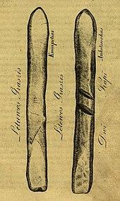 Daukantas had to create numerous neologisms. The three volume Polish–Lithuanian dictionary contained about 3,800 neologisms.[150] As one of the first to write a grammar in Lithuanian, he had to create a number of grammatical terms.[194] Of the many neologism, a few became widely accepted and used in the modern standard Lithuanian, including laikrodis (clock), prekyba (trade), vaistininkas (pharmacist), vietovė (location), būdvardis (adjective), while many other were rejected, including aušrėnai (Balts), laikoskaitlis (chronology), rūdarbis (tailor).[159] He did not consider Latvian to be a foreign language and often borrowed its words, for example asinas from Latvian asins for blood, muižė from Latvian muiža for manor.[159] One of such borrowed words, valstybė for state or polity, became a standard Lithuanian word.[195] Daukantas was an amateur linguist and frequently offered etymologies that were based on similar sounding words instead of the scientific comparative method.[159]