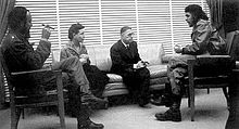 Perhaps her most famous lover was American author Nelson Algren whom she met in Chicago in 1947, and to whom she wrote across the Atlantic as "my beloved husband."[29] Algren won the National Book Award for The Man with the Golden Arm in 1950, and in 1954, Beauvoir won France's most prestigious literary prize for The Mandarins in which Algren is the character Lewis Brogan. Algren vociferously objected to their intimacy becoming public. Years after they separated, she was buried wearing his gift of a silver ring.[30] However, she lived with Claude Lanzmann from 1952 to 1959.[31]