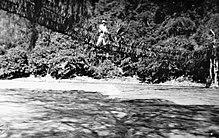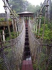 In French, a rudimentary simple suspension bridge is known by one of three names, depending on its form: pont himalayen ("Himalayan bridge": a single footrope and handrails on both sides, usually without a deck); pont de singe ("monkey bridge: a footrope with overhead rope); and tyrolienne ("Tyrolean": a zip-line).[22] Zip-lines can be traversed by hanging below, or walked (by individuals with exceptional balance). A more developed version of the pont himalayen, provided with a deck between a pair of main cables, is known as a passerelle himalayenne (French, "Himalayan footbridge").[23] Examples of this type include two bridges at Lac de Monteynard-Avignonet in the French Alps; these bridges are exceptionally long, for bridges of this type.