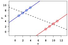 Simpson's paradox, which also goes by several other names, is a phenomenon in probability and statistics, in which a trend appears in several different groups of data but disappears or reverses when these groups are combined. This result is often encountered in social-science and medical-science statistics[1][2][3] and is particularly problematic when frequency data is unduly given causal interpretations.[4] The paradox can be resolved when causal relations are appropriately addressed in the statistical modeling.[4][5] It is also referred to as Simpson's reversal, Yule–Simpson effect, amalgamation paradox, or reversal paradox.[6]