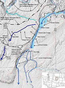 These lava flows have been extensively exposed by the erosion resulting from the Missoula Floods, which laid bare many layers of the basalt flows on the edges of the plateau at Grand Coulee and Moses Coulee.[2][3][4][5][6]