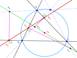 - Let ABC be a triangle, let a line ℓ go through circumcenter O, and let a point P lie on the circumcircle. Let AP, BP, CP meet ℓ at Ap, Bp, Cp respectively. Let A0, B0, C0 be the projections of Ap, Bp, Cp onto BC, CA, AB, respectively. Then A0, B0, C0 are collinear. Moreover, the new line passes through the midpoint of PH, where H is the orthocenter of ΔABC. If ℓ passes through P, the line coincides with the Simson line. [8][9][10]
