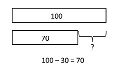The solution to this problem could be solved by drawing one bar and dividing it into two parts, with the longer part as 70 and the shorter part as 30. By visualizing these two parts, students would simply solve the above word problem by adding both parts together to build a whole bar of 100. Conversely, a student could use whole-part model to solve a subtraction problem such as 100 - 70, by having the longer part be 70 and the whole bar be 100. They would then solve the problem by inferring the shorter part to be 30.