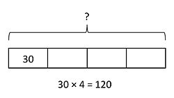 The student could solve this multiplication problem by drawing one bar to represent the unknown answer, and subdivide that bar into four equal parts, with each part representing $30. Based on the drawn model, the student could then visualize this problem as providing a solution of $120.