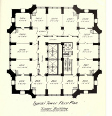 The floors of the tower contained a "U"-shaped layout surrounding the elevators in the center of the building, with emergency stairs in the tower's core. In the Singer Building's tower, there were very few partitions, except for elevators and restrooms.[69][87] The average floor in the tower contained 16 offices.[14][19] On these floors, the ceilings were painted ivory and the walls were olive green.[81] The Singer Company's main offices on the 33rd through 35th floors, where there was a plethora of ornamental plaster.[71]