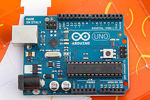 Arduino UNO R2 board with ATmega328P 8-bit microcontroller in 28-pin IC socket
