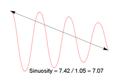 Sinuosity, sinuosity index, or sinuosity coefficient of a continuously differentiable curve having at least one inflection point is the ratio of the curvilinear length (along the curve) and the Euclidean distance (straight line) between the end points of the curve. This dimensionless quantity can also be rephrased as the "actual path length" divided by the "shortest path length" of a curve. The value ranges from 1 (case of straight line) to infinity (case of a closed loop, where the shortest path length is zero or for an infinitely-long actual path[1]).