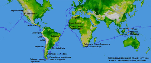 Sir Francis Drake, vice admiral (c. 1540 – 28 January 1596[3]) was an English sea captain, privateer, navigator, slaver, and politician of the Elizabethan era. Drake carried out the second circumnavigation of the world in a single expedition, from 1577 to 1580, and was the first to complete the voyage as captain while leading the expedition throughout the entire circumnavigation. With his incursion into the Pacific Ocean, he inaugurated an era of privateering and piracy in the western coast of the Americas—an area that had previously been free of piracy.[4]