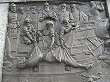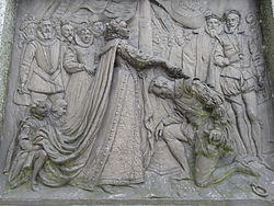 Queen Elizabeth awarded Drake a knighthood aboard Golden Hind in Deptford on 4 April 1581; the dubbing being performed by a French diplomat, Monsieur de Marchaumont, who was negotiating for Elizabeth to marry the King of France's brother, Francis, Duke of Anjou.[26][27] By getting the French diplomat involved in the knighting, Elizabeth was gaining the implicit political support of the French for Drake's actions.[28][29] During the Victorian era, in a spirit of nationalism, the story was promoted that Elizabeth I had done the knighting.[27][30]