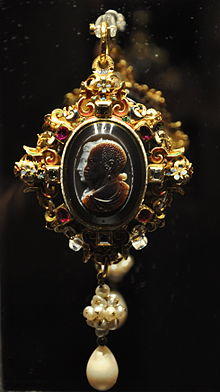 For her part, the Queen gave Drake a jewel with her portrait, an unusual gift to bestow upon a commoner, and one that Drake sported proudly in his 1591 portrait by Marcus Gheeraerts now at the National Maritime Museum, Greenwich. On one side is a state portrait of Elizabeth by the miniaturist Nicholas Hilliard, on the other a sardonyx cameo of double portrait busts, a regal woman and an African male. The "Drake Jewel", as it is known today, is a rare documented survivor among sixteenth-century jewels; it is conserved at the Victoria and Albert Museum, London.[24]