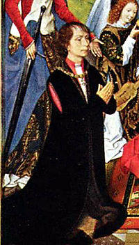Sir John Donne (probably born in 1420s – 1503) was a Welsh courtier, diplomat and soldier, a notable figure of the Yorkist party. In the 1470s he commissioned the Donne Triptych, a triptych altarpiece by Hans Memling now in the National Gallery, London. It contains portraits of him, his wife Elizabeth and a daughter. He may well have been related to the Jacobean poet John Donne, although not as a direct ancestor, as he had no Donne grandchildren.
