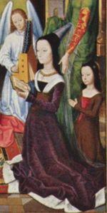 The Donne Triptych by Hans Memling would presumably have been made in Bruges, and is believed to date from the 1470s. Many sources still date it to 1468, because they were only aware of Donne's visit to Bruges for the wedding in that year, and because when the donor was first identified as Donne in 1840, the writer (J. G. Nichols) wrongly stated that he was killed in the Battle of Edgecote in 1469. The National Gallery now favours a date in the late 1470s, perhaps 1478, the date on a later copy, which is plausible, and may have been on the lost original frame. The Donne coat of arms appears on small escutcheons in the capital of the column behind Sir John, rather roughly represented, and impaled with that of Hastings on the capital behind Lady Donne. The Donne arms also appear in a glass roundel in the window in the right side panel.[2]