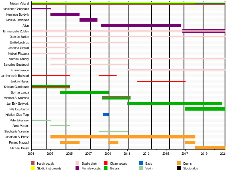 - Jan Kenneth Barkved – clean vocals (2001–2002, 2008; died 2009)