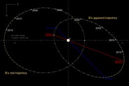 The visible star is now sometimes known as Sirius A. Since 1894, some apparent orbital irregularities in the Sirius system have been observed, suggesting a third very small companion star, but this has never been confirmed. The best fit to the data indicates a six-year orbit around Sirius A and a mass of 0.06 M☉. This star would be five to ten magnitudes fainter than the white dwarf Sirius B, which would make it difficult to observe.[49] Observations published in 2008 were unable to detect either a third star or a planet. An apparent "third star" observed in the 1920s is now believed to be a background object.[50]