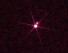 Sirius is a binary star system consisting of two white stars orbiting each other with a separation of about 20 AU[e] (roughly the distance between the Sun and Uranus) and a period of 50.1 years. The brighter component, termed Sirius A, is a main-sequence star of spectral type early A, with an estimated surface temperature of 9,940 K.[13] Its companion, Sirius B, is a star that has already evolved off the main sequence and become a white dwarf. Currently 10,000 times less luminous in the visual spectrum, Sirius B was once the more massive of the two.[82] The age of the system has been estimated at around 230 million years. Early in its life, it is thought to have been two bluish-white stars orbiting each other in an elliptical orbit every 9.1 years.[82] The system emits a higher than expected level of infrared radiation, as measured by IRAS space-based observatory. This might be an indication of dust in the system, which is considered somewhat unusual for a binary star.[80][83] The Chandra X-ray Observatory image shows Sirius B outshining its partner as an X-ray source.[84]