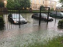 Houston generally receives ample rainfall, averaging about 49.8 in (1,260 mm) annually based on records between 1981 and 2010. Many parts of the city have a high risk of localized flooding due to flat topography,[110] ubiquitous low-permeability clay-silt prairie soils,[111] and inadequate infrastructure.[110] During the mid-2010s, Greater Houston experienced consecutive major flood events in 2015 ("Memorial Day"),[112] 2016 ("Tax Day"),[113] and 2017 (Hurricane Harvey).[114] Overall, there have been more casualties and property loss from floods in Houston than in any other locality in the United States.[115] The majority of rainfall occurs between April and October (the wet season of Southeast Texas), when the moisture from the Gulf of Mexico evaporates extensively over the city.[112][115]