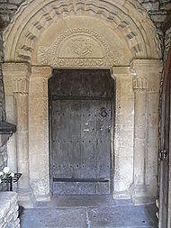 The original Norman church was built of rubble in the mid-12th century.[34][35] St Anne's Church, located between Siston Court and the village of Siston, is at the edge of open fields and has scenic views of the countryside.[35] It was rebuilt and expanded in the 13th century and from the 17th to the 20th centuries.[34][35] It has a west tower and a gabled south porch, with a small chapel protruding from the south wall. A tree of life is sculpted on the Norman tympanum of the south doorway. The most important feature of the interior is a 12th-century lead baptismal font. Many of the features and furnishings in the interior date from the 17th to 19th centuries.[34] South of the church is the formal Georgian rectory. According to an 1839 tithe map, the church had a formal garden, now the site of the church hall.[35]