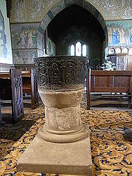 - ^ Only about 38 leaden fonts survive in England, nine of which are in Gloucestershire, the greatest number in any county.[36] Other similar fonts exist in the Lady Chapel of Gloucester Cathedral (given to the cathedral in 1940, originally from St. James's Church, Lancaut, Glos., now ruined); at Frampton-on-Severn; Rendcomb-St-Peter and at Dorchester Abbey.[36]