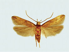 The Angoumois grain moth (Sitotroga cerealella) is a species of gelechioid moth. It is the type species of its genus Sitotroga, placed in the subfamily Pexicopiinae of the twirler moth family (Gelechiidae). Formerly, it was included in the "Chelariinae", which more recent authors do not separate from the Pexicopiinae and usually even do not consider a distinct tribe ("Chelariini") within them.[1]
