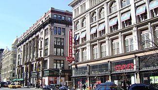 Sights along Sixth Avenue include Juan Pablo Duarte Square;[29] with the polychrome High Victorian Gothic Jefferson Market Courthouse, currently occupied by the Jefferson Market Library;[30] the surviving stretch of grand department stores of 1880 to 1900 in the Ladies' Mile Historic District that runs from 18th Street to 23rd Street;[31] the former wholesale flower district; Herald Square at 34th Street,[32] site of Macy's department store;[33] Bryant Park from 40th to 42nd Streets;[34] and the corporate stretch above 42nd Street, which includes the Bank of America Tower, W. R. Grace Building, International Center of Photography, Rockefeller Center — including the Time-Life Building, News Corp. Building, Exxon Building and McGraw-Hill Building, as well as Radio City Music Hall. The Steinway Hall of New York was moved to 1133 Sixth Avenue in 2016.[35]