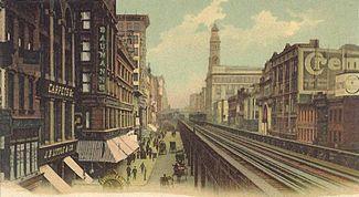 Sixth Avenue was laid out in the Commissioners' Plan of 1811. As originally designed, Sixth Avenue's southern terminus was at Carmine Street in Greenwich Village, and it continued northward to 147th Street in Harlem. Central Park was added to the street grid in 1857, and created an interruption in Sixth Avenue between 59th and 110th Streets. Proposals to extend the street south of Carmine Street were discussed by the city's Board of Aldermen as early as the mid-1860s.[6] The IRT Sixth Avenue Line elevated railway (the "El") was constructed on Sixth Avenue in 1878, darkening the street and reducing its real-estate value. In the early and mid 1800s Sixth Avenue passed by the popular roadhouse and tavern, Old Grapevine, at the corner of 11th Street, which at the time was the northern edge of the city.[7]