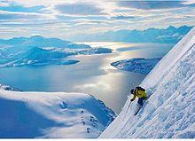 Ski mountaineering (abbreviated to skimo)[1] is a skiing discipline that involves climbing mountains either on skis or carrying them, depending on the steepness of the ascent, and then descending on skis. There are two major categories of equipment used, free-heel Telemark skis and skis based on Alpine skis, where the heel is free for ascents, but is fixed during descent.[2] The discipline may be practiced recreationally or as a competitive sport.[3]