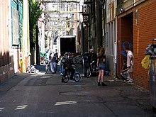 A skid row or skid road is an impoverished area, typically urban, in English-speaking North America whose inhabitants are people "on the skids". This specifically refers to the poor, the homeless or others either considered disreputable or forgotten by society.[1] A skid row may be anything from an impoverished urban district to a red-light district to a gathering area for the homeless. In general, skid row areas are inhabited or frequented by individuals marginalized by poverty or through drug addiction. Urban areas considered skid rows are marked by high vagrancy, and they often feature cheap taverns, dilapidated buildings, and drug dens as well as other features of urban blight. Used figuratively, it may indicate the state of a poor person's life.