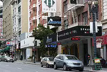 It is known for its immigrant populations, single room occupancy hotels, ethnic restaurants, bars and clubs, alternative arts scene, large homeless population, public transit and close proximity to Union Square, the Financial District, and Civic Center.[22] The 2000 census reported a population of 28,991 persons, with a population density of 44,408/mi² (17,146/km²), in the Tenderloin's 94102 Zip Code Tabulation Area, which also includes the nearby Hayes Valley neighborhood.[23]