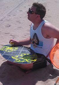 Skimboarding or skimming is a boardsport in which a skimboard (much like a surfboard but smaller and without fins) is used to glide across the water's surface to meet an incoming breaking wave, and ride it back to shore. Wave-riding skimboarders perform a variety of surface and air maneuvers, at various stages of their ride, out to, and back with, the wave. Some of these are known as "wraps," "big spins," "360 shove-its" and "180s." Unlike surfing, skimboarding begins on the beach by dropping the board onto the thin wash of previous waves. Skimboarders use their momentum to skim out to breaking waves, which they then catch back into shore in a manner similar to surfing.