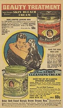 According to historian Kathy Peiss, skin whitening among black American women had been documented starting in the mid-nineteenth century.[72] Historians credited the increased marketing of skin whiteners to the culture of the Jim Crow era, as black Americans faced continued social and legal restrictions.[58][73] Cosmetic advertisements directed at black consumers often framed resulting lighter complexions as cleaner and better.[72][63] Simultaneously, however, cosmetic and beauty magazines often published criticisms of black women who used skin bleachers, arguing that they appeared unnatural and fraudulent.[72][63]