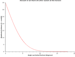 When the sun's altitude is < -6° 99% of the atmosphere in zenith is in the Earth's shadow and second order scattering takes over. At the horizon, however, 35% of the atmosphere along the line of sight is still directly illuminated, and continues to be until the sun reaches -12°. From -12° to -18° only the uppermost parts of the atmosphere along the horizon, directly above the spot where the sun is, is still illuminated. After that, all direct illumination ceases and astronomical darkness sets in.