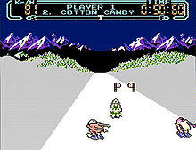 Also located on the runs are moguls (bumps) that, when hit, causes the racer to go airborne and slow down slightly when landing.[5] While airborne, players can perform freestyle tricks and earn bonus points. However, if the player botches the trick, the racer may tumble and fall, losing time. At the end of each run, final scores are calculated based on the amount of time remaining on the run and points scored from completing freestyle tricks.[6] If the player earns enough points, they may race the next level "solo" (without other skiers onscreen).[4] The points earned in qualifying runs convert to additional seconds on the solo run timer.[6] The high scores on each of the runs are saved in memory until the console is powered off.[2]