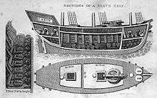 In the 18th and early 19th centuries, the sailors on slave ships were often poorly paid and subject to brutal discipline and treatment.[13] Furthermore, a crew mortality rate of around 20% was expected during a voyage, with sailors dying as a result of disease, flogging or slave uprisings.[14][15] While conditions for the crew were far better than those of the enslaved people, they remained harsh and contributed to a high death rate. Sailors often had to live and sleep without shelter on the open deck for the entirety of the Atlantic voyage as the space below deck was occupied by slaves.[13]