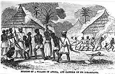 The Annual Customs of Dahomey were the most notorious example of the human sacrifice of slaves, where 500 prisoners would be sacrificed.[44] Sacrifices were carried out all along the West African coast and further inland.[45] Sacrifices were common in the Benin Empire, in what is now Ghana, and in the small independent states in what is now southern Nigeria.[46] In the Ashanti Region, human sacrifice was often combined with capital punishment.[47][48][49]