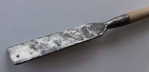 A slick is a large chisel, characterized by a wide (2-4 inches, 5–10 cm), heavy blade, and a long, frequently slender, socketed handle. The combined blade and handle can reach two feet (60 cm) in length. The blade of a slick is slightly curved lengthwise, and/or the handle socket is cranked upward, such that the handle and socket clear the surface of the work when the edge is touching. This distinguishes the slick from the similarly-sized, short-handled millwright's chisel.
