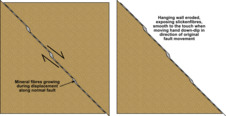 In geology, a slickenside is a smoothly polished surface caused by frictional movement between rocks along the two sides of a fault. This surface is normally striated in the direction of movement. The plane may be coated by mineral fibres that grew during the fault movement, known as slickenfibres, which also show the direction of displacement. Due to irregularities in the fault plane exposed slickenfibres typically have a stepped appearance that can be used to determine the sense of movement across the fault. The surface feels smoother when the hand is moved in the same direction that the eroded side of the fault moved (see diagram for explanation), as the surface steps down in that direction, like the scales on a fish when stroked from the head.