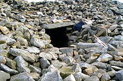 There are two burial cairns on top of the hill, on either side of a small lake. The southern one is a large passage tomb, the highest surviving passage tomb in Ireland.[10] In 1961, a team of archaeologists explored the site and set up a 30-person camp near the summit.[11] The tomb's cairn is 30 m (97 ft) wide and 5 m (16 ft) high. The chamber inside is 3.6 m (12 ft) wide, with a corbelled roof up to 4.3 m (14 ft) high. It contained three large blocks of stone seemingly used as basins, and fragments of human bone. Some bits of worked flint and a barbed-end arrowhead were also found, "the meager remnants that survived the centuries of tomb raiding".[12] The entrance is aligned with the setting sun on the winter solstice.[13] Radiocarbon dating suggests it was built c.3500–2900 BCE.[14] The smaller cairn to the north of the lake was built later, perhaps during the Bronze Age. It contains two cist burials, with one containing bits of burnt bone; likely the remains of a single adult.[15]