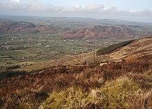 Slieve Gullion (from Irish: Sliabh gCuillinn, meaning "hill of the steep slope"[2] or Sliabh Cuilinn, "Culann's mountain")[3] is a mountain in the south of County Armagh, Northern Ireland. The mountain is the heart of the Ring of Gullion and is the highest point in the county, with an elevation of 573 metres (1,880 ft). At the summit is a small lake and two ancient burial cairns, one of which is the highest surviving passage grave in Ireland. Slieve Gullion appears in Irish mythology, where it is associated with the Cailleach and the heroes Fionn mac Cumhaill and Cú Chulainn. It dominates the countryside around it, offering views as far away as Antrim, Dublin Bay and Wicklow on a clear day.[4] Slieve Gullion Forest Park is on its eastern slope.